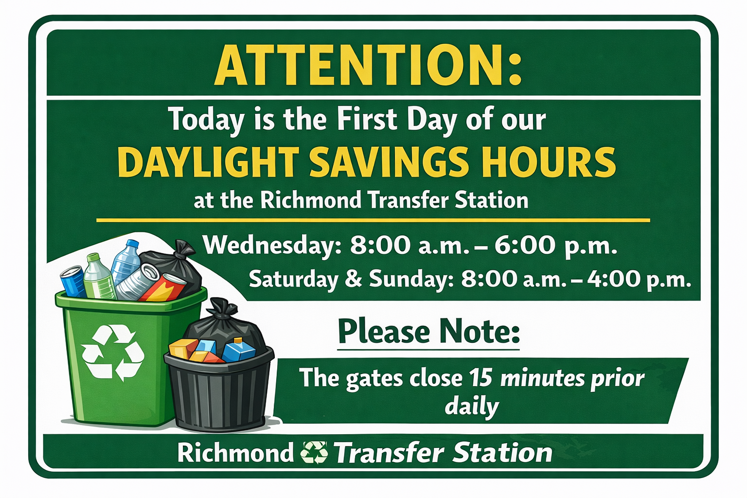 The Richmond Transfer Station is now open Wednesday from 8:00 AM to 5:45 PM during daylight savings time. ⏰
